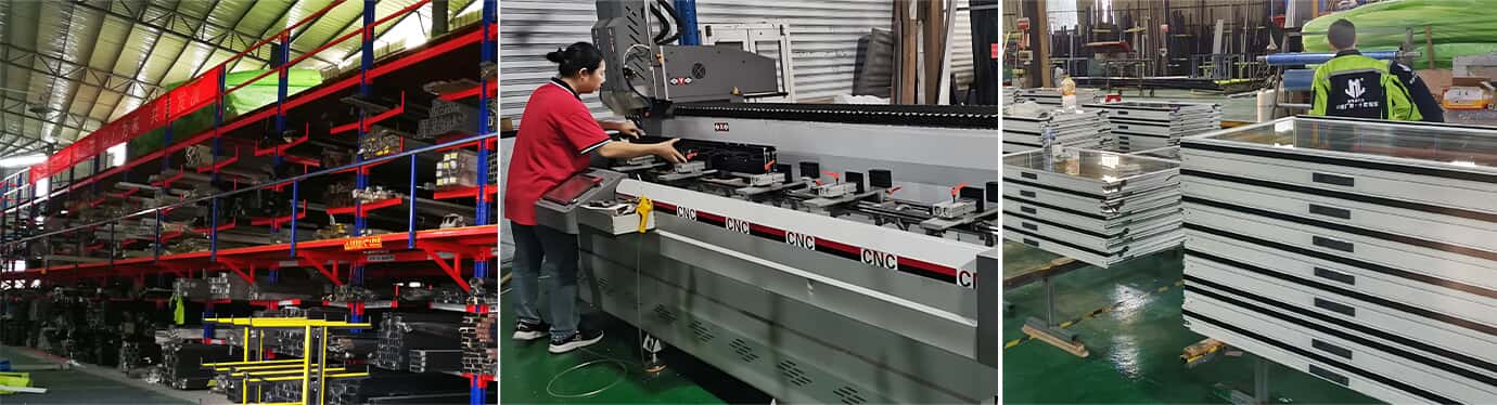 2)Complete production line: extrusion, cutting, drilling, assembling, glazing, quality inspection.